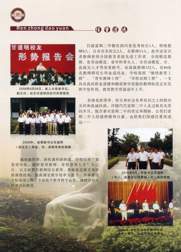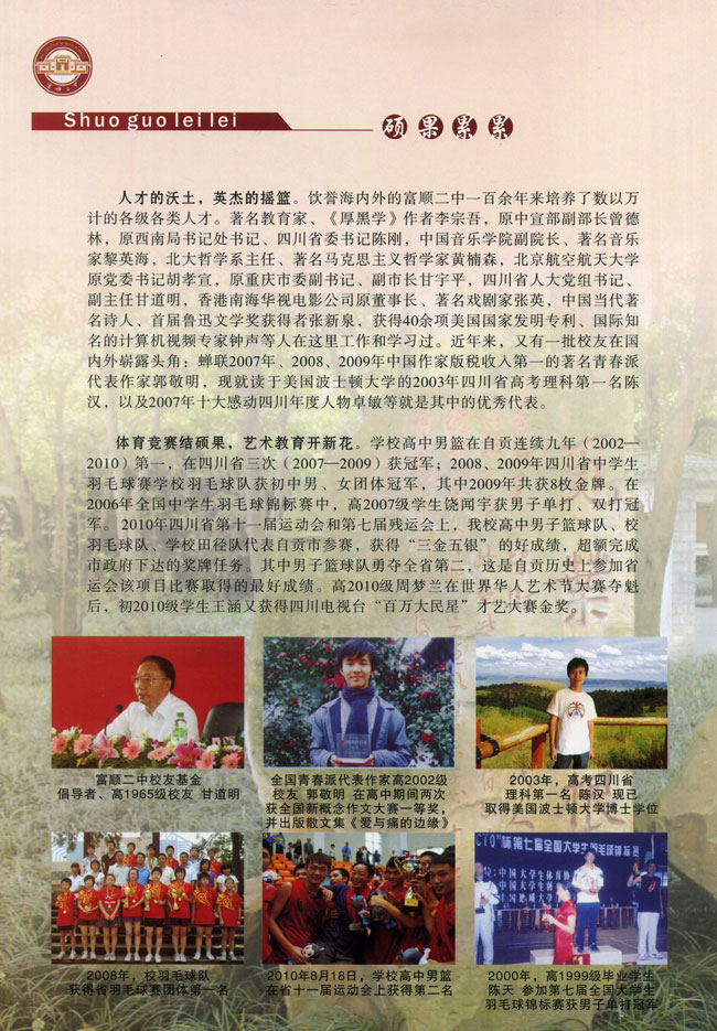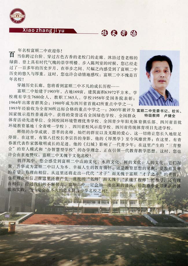國(guó)家級(jí)示范性普通高中——四川省富順第二中學(xué)校,是全省首批42所重點(diǎn)中學(xué)之一,始建于1903年(清光緒29年),位于富順縣城北十字嶺,占地面積169畝,遠(yuǎn)期規(guī)劃用地327.5畝,建筑面積63972平方米。校內(nèi)花木扶疏,樓亭掩映,湖光山色,環(huán)境幽雅,是美麗的園林式校園,2003年被命名為全國(guó)綠色學(xué)校(全省五所,全市唯一)。