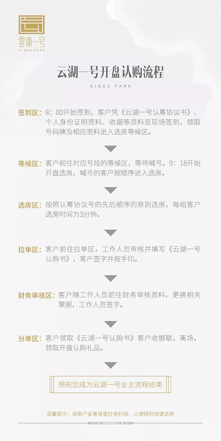 您好,為了方便您更安心、更便捷的參與云湖一號首批次盛大開盤活動,為了讓您能滿意的選購到心儀房源,現(xiàn)將此次開盤的事宜作如下溫馨提示:
