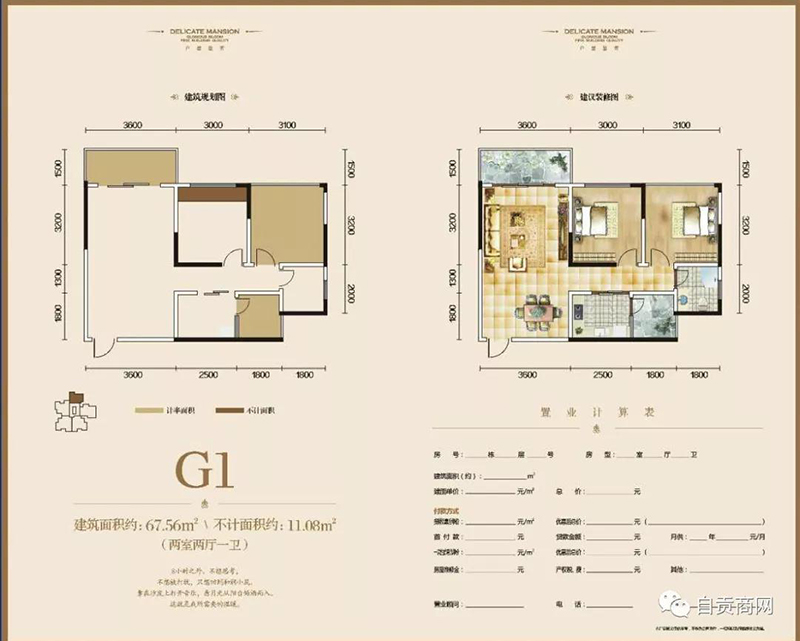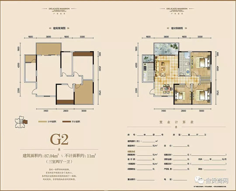 2、三室兩廳:G2面積86.12㎡。G3面積105.99㎡。G4面積110.76㎡。G5面積100.04㎡。