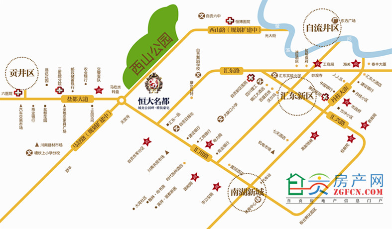 恒大名都雄踞自貢城市核心——馬吃水轉(zhuǎn)盤,西臨西山公園,與自流井區(qū)東方廣場(chǎng)、匯東新區(qū)人人樂、貢井區(qū)政府直線距離均約3公里,是自貢毋庸置疑的幾何中心和交通樞紐。地理位置優(yōu)越,有近20條公交線路交匯于此,極大滿足業(yè)主的出行需求。