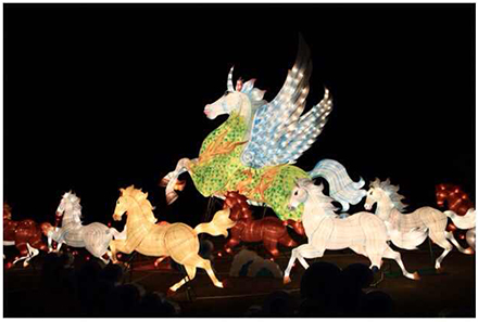 馬年看馬燈,主燈“龍馬騰霄”為燈展之最,高達(dá)22米;展現(xiàn)武漢特色的巨型燈組“熱干面”設(shè)計新穎,制作精美,引人遐思。