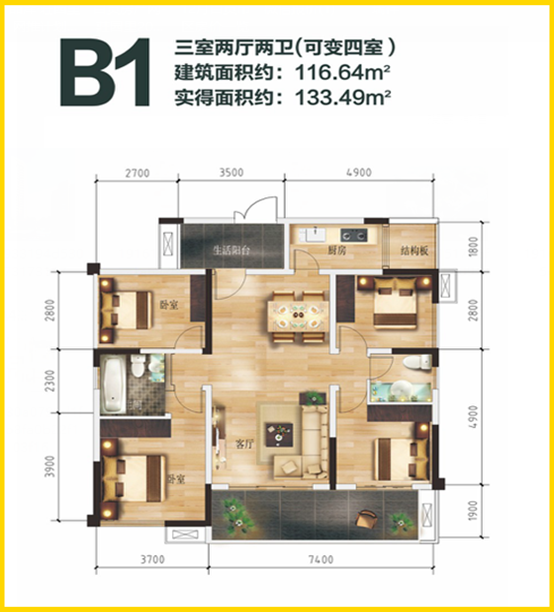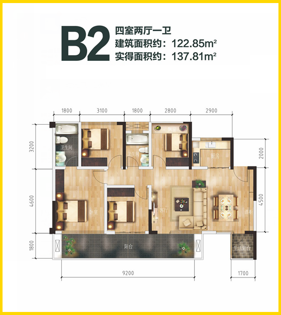 1、四室兩廳:
