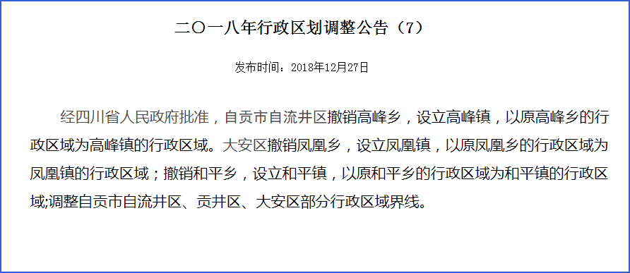 其中,自貢市自流井區(qū)撤銷高峰鄉(xiāng),設(shè)立高峰鎮(zhèn),以原高峰鄉(xiāng)的行政區(qū)域?yàn)楦叻彐?zhèn)的行政區(qū)域。大安區(qū)撤銷鳳凰鄉(xiāng),設(shè)立鳳凰鎮(zhèn),以原鳳凰鄉(xiāng)的行政區(qū)域?yàn)轼P凰鎮(zhèn)的行政區(qū)域;撤銷和平鄉(xiāng),設(shè)立和平鎮(zhèn),以原和平鄉(xiāng)的行政區(qū)域?yàn)楹推芥?zhèn)的行政區(qū)域。同時(shí),調(diào)整自貢市自流井區(qū)、貢井區(qū)、大安區(qū)部分行政區(qū)域界線。