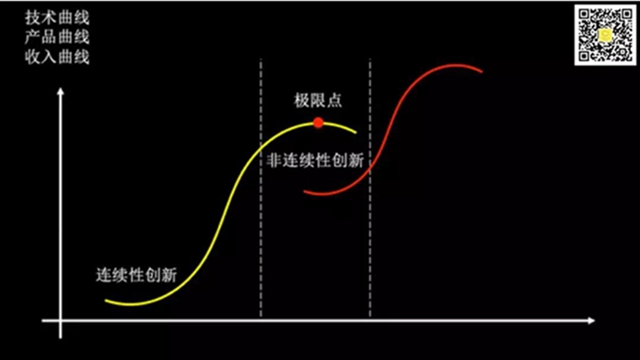 但是,如同我剛剛講過(guò)的,極限點(diǎn)不可避免。這時(shí)候,有另一種創(chuàng)新,我稱(chēng)之為非連續(xù)性創(chuàng)新。它并不是在一條曲線里漸進(jìn)性地改良,而是從一條曲線轉(zhuǎn)換為第二條曲線,而第二條曲線和第一條曲線之間,存在著一個(gè)看上去跨越不過(guò)去的鴻溝。