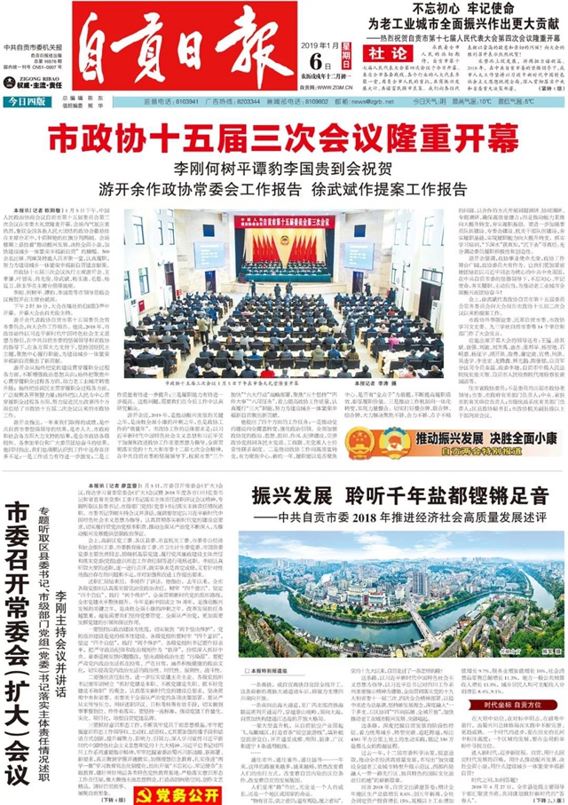2019年1月6日,自貢日報刊發(fā)重磅雄文《振興發(fā)展 聆聽千年鹽都鏗鏘足音——中共自貢市委2018年推進經(jīng)濟社會高質(zhì)量發(fā)展述評》。