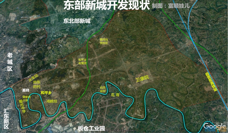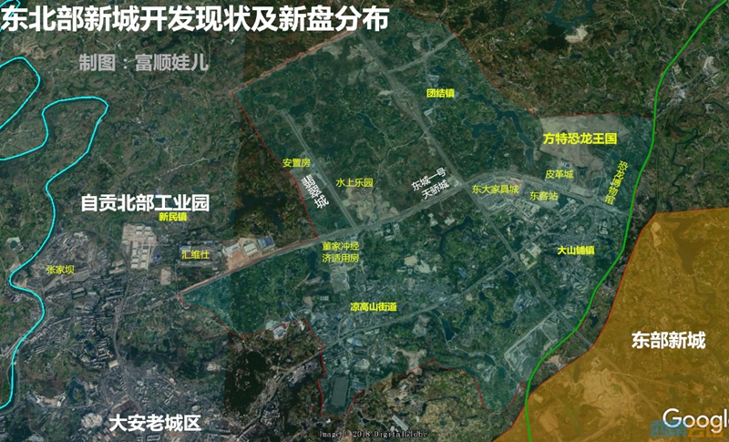 從圖中可以看出,目前屬于舊城區(qū)的東興寺以東的三八路、火車站、代家壩、鴻鶴壩、和平鄉(xiāng)等片區(qū)都屬于東部新城。很明顯,東部新城大致以內(nèi)宜高速為界也可分為東區(qū)和西區(qū),西區(qū)主要就是由上述舊城區(qū)域進(jìn)行改造升級(jí),而東區(qū)才是包含大山鋪鎮(zhèn)、仙市鎮(zhèn)等鄉(xiāng)鎮(zhèn)在內(nèi)的廣大農(nóng)村地區(qū),東區(qū)才是未來東部新城“開發(fā)”的核心區(qū)域,該區(qū)域內(nèi)包括了華僑城彩燈大世界和高鐵自貢東站等重大項(xiàng)目。目前,東部新城主要是進(jìn)行地下管網(wǎng)、城市干道等城市基礎(chǔ)設(shè)施建設(shè),東區(qū)僅有衛(wèi)康院、嘉祥自貢校區(qū)、彩燈大世界、和平鄉(xiāng)安置房(位于內(nèi)宜高速西側(cè))等項(xiàng)目。