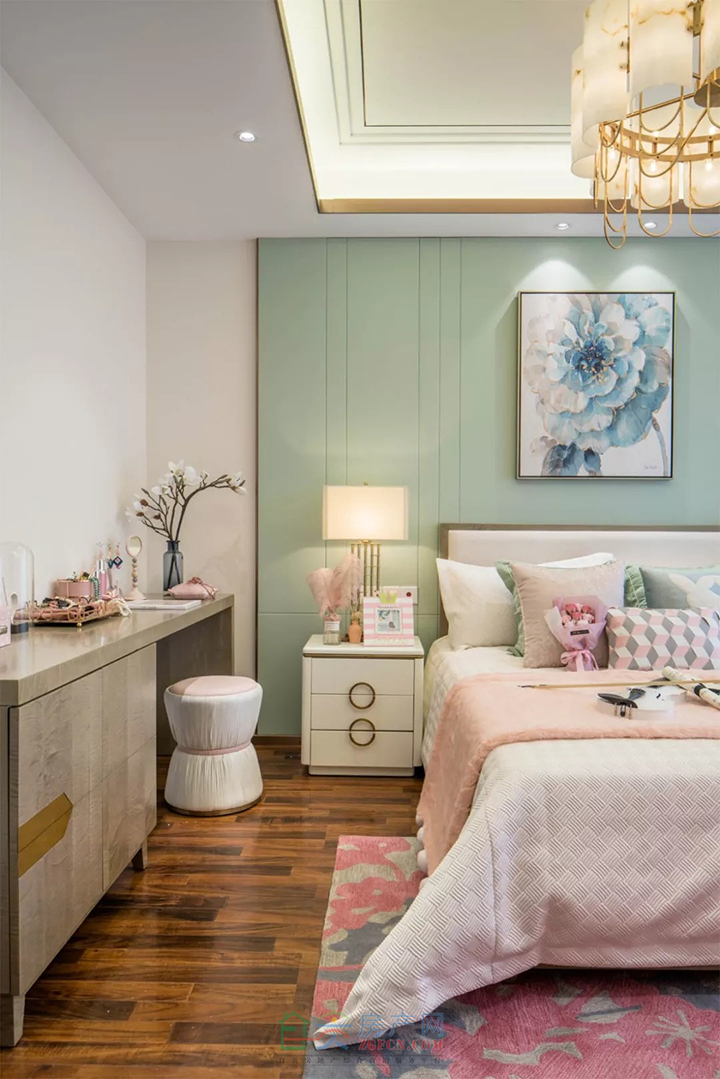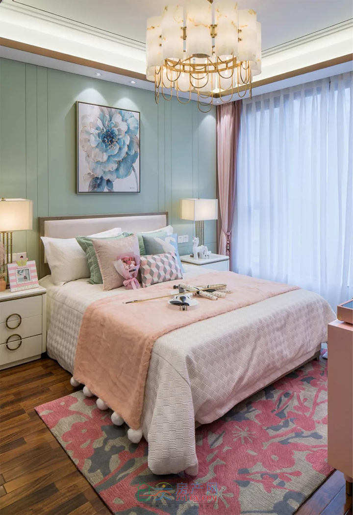 女孩房選用莫蘭迪色作為整個(gè)基調(diào),和新中式的撞擊帶來(lái)溫柔之美。寥若數(shù)筆竹葉呼應(yīng)床頭的玉蘭,暗香疏影的含蓄之美。