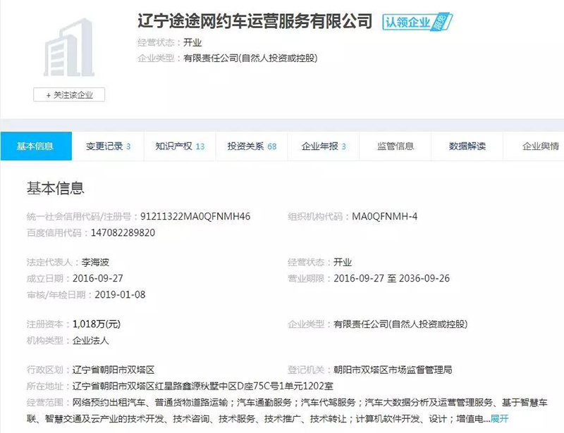 又一個(gè)遼寧途途網(wǎng)約車運(yùn)營(yíng)服務(wù)有限公司