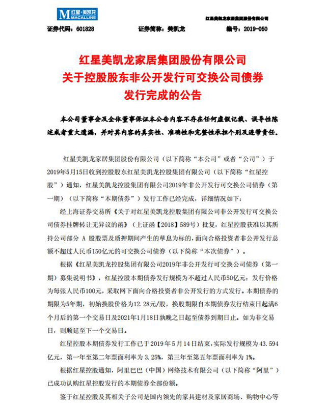 【美凱龍:阿里巴巴逾43億全額認(rèn)購控股股東發(fā)行的可交換債】美凱龍(601828)5月15日晚間公告,公司控股股東紅星控股成功發(fā)行可交換債券,以43.594億元被阿里巴巴全額認(rèn)購。紅星控股此次發(fā)行的可交換債以其所持公司部分A股股票及質(zhì)押期間產(chǎn)生的孳息為標(biāo)的,債券期限5年,初始換股價12.28元/股。