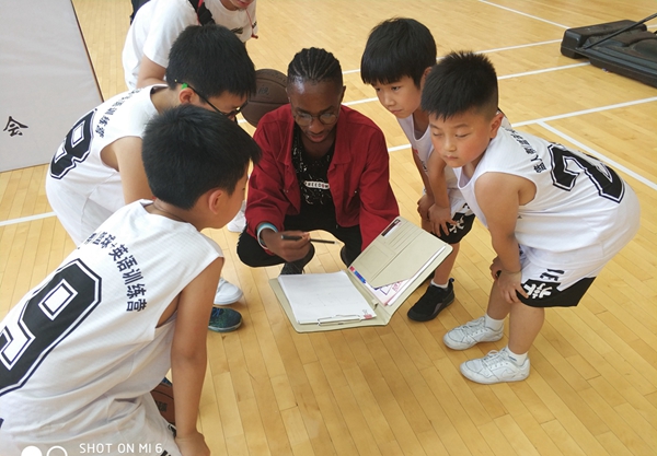 這是自貢籃人幫籃球+英語訓(xùn)練營的外籍教練,本次小籃球聯(lián)賽,適逢朱諾回國辦理簽證事宜,特別請他的球隊師兄來賽場指揮作戰(zhàn)。在賽場,我們可以看到一位黑人手拿戰(zhàn)術(shù)板示范、講解戰(zhàn)術(shù),有板有眼的為小球員講解、指教,督促小球員們做好賽前準備活動。這引來現(xiàn)場家長的圍觀和交流。由于“黑”教練并非精通中文,他與小球員們采用了中英雙語交流模式,使得小球員們在籃球訓(xùn)練之余,也能得到更多的收獲。