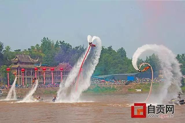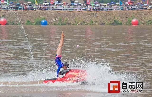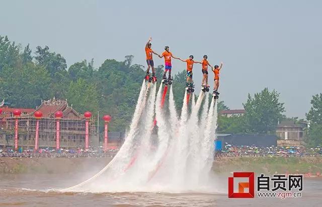 當(dāng)天,除了競龍舟、搶鴨子等民俗活動外,還舉行了精彩的文藝表演、水上表演。其中,最吸引眼球的是,來自中國國家特技滑水隊帶來的“水上飛行器”表演,5名“空人飛人”們將腳踏在5、6米高的水柱上在表演后空翻、鉆石等各種高難度的花式動作,猶如“水上鋼鐵俠”一般,引發(fā)了全場歡呼。