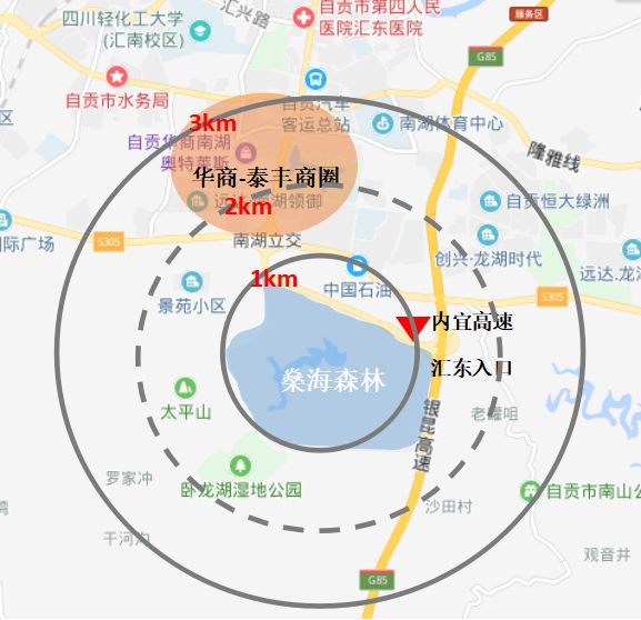 圣托里尼M酒店位于燊海森林項(xiàng)目的中心位置,緊臨銀昆高速匯東出口,為自貢市發(fā)展新區(qū),人口密度較低,屬于臥龍湖生態(tài)景觀區(qū)。距高新區(qū)核心商圈華商-泰豐商圈直線距離1.6km,距離市區(qū)核心商圈五星路商圈直線距離5.8km。