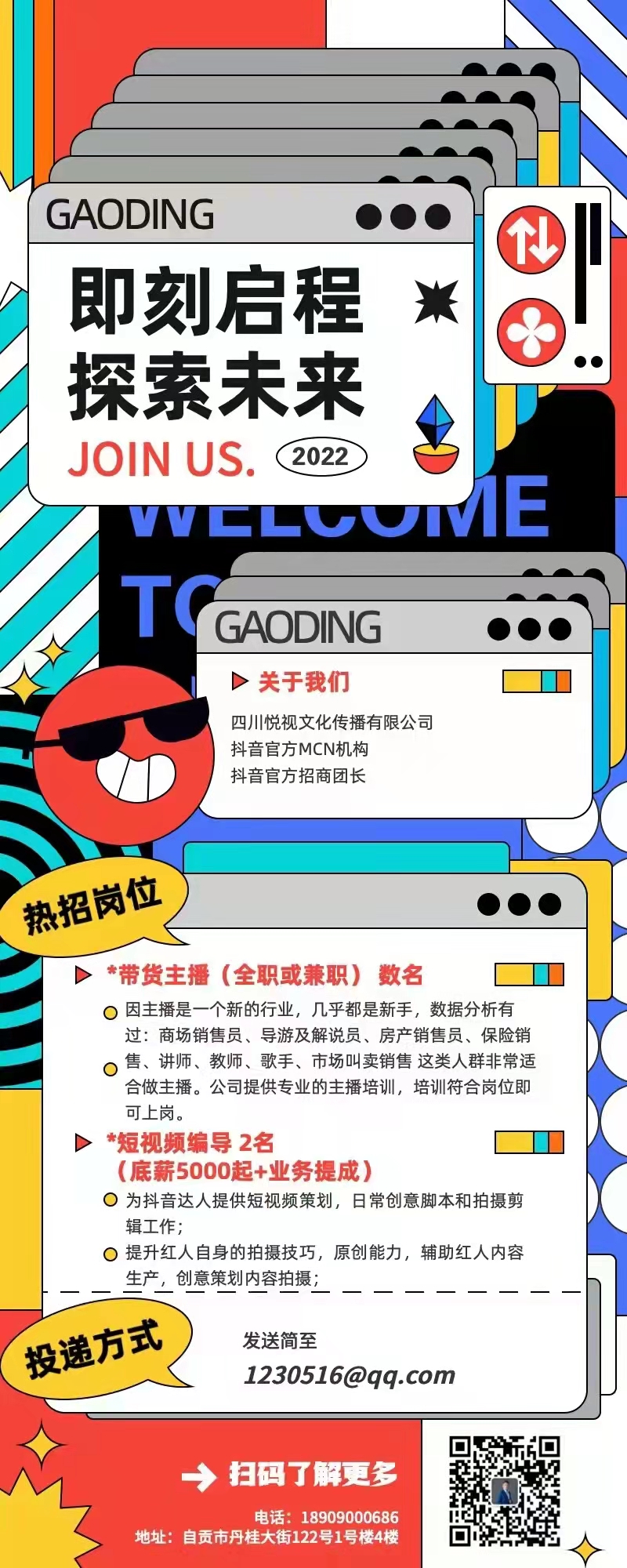 高薪招聘短視頻編導(dǎo),攝像,剪輯,帶貨主播,直播運(yùn)營(yíng)。